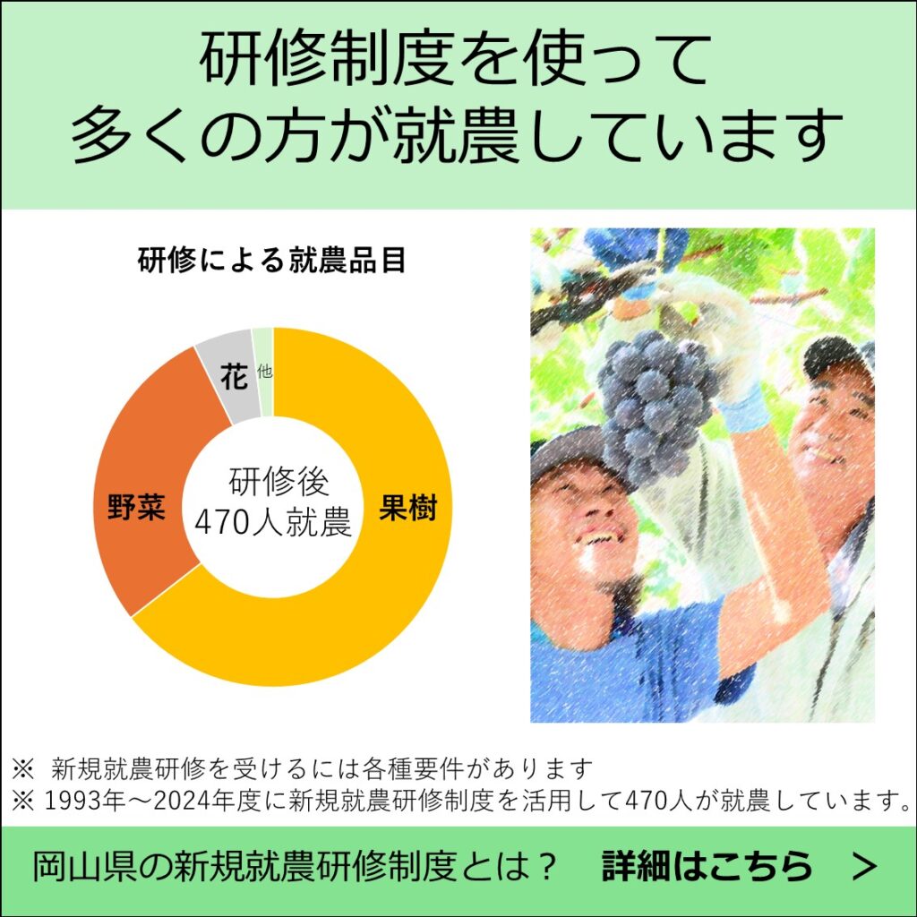 岡山県で新たな一歩を踏み出したい方は、ぜひ就農ポータルサイト「晴れの国岡山で農業を始めませんか」をご覧ください。