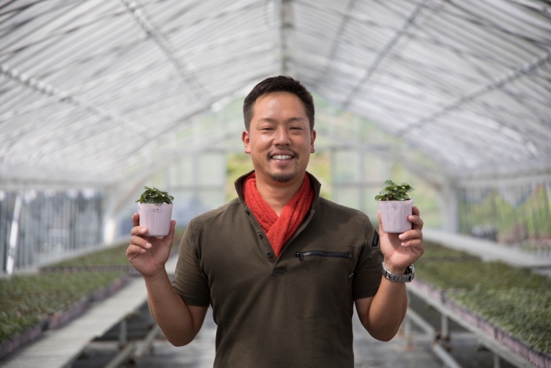 2015年4月に花壇苗(花の苗)農家として新規就農した永谷竜一(ながやりゅういち)さん(32歳)。永谷さんは故郷・美作市で就農の夢を叶えた。